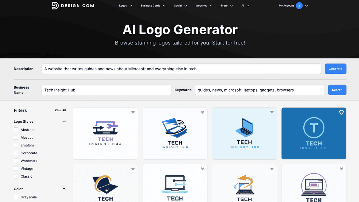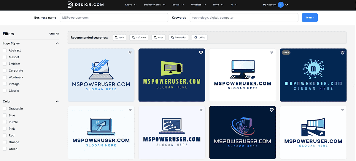 Design.com creates results immediately after inputting the business name and industry. From there, you can filter logos by: