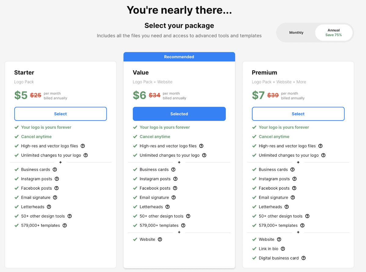 Wix is cheaper if you only need a one-time logo file, but it becomes more expensive once you start adding branding features. Design.com delivers significantly more tools, templates, and file formats at lower monthly price points. If you plan to build a full brand identity, Design.com offers better long-term value.