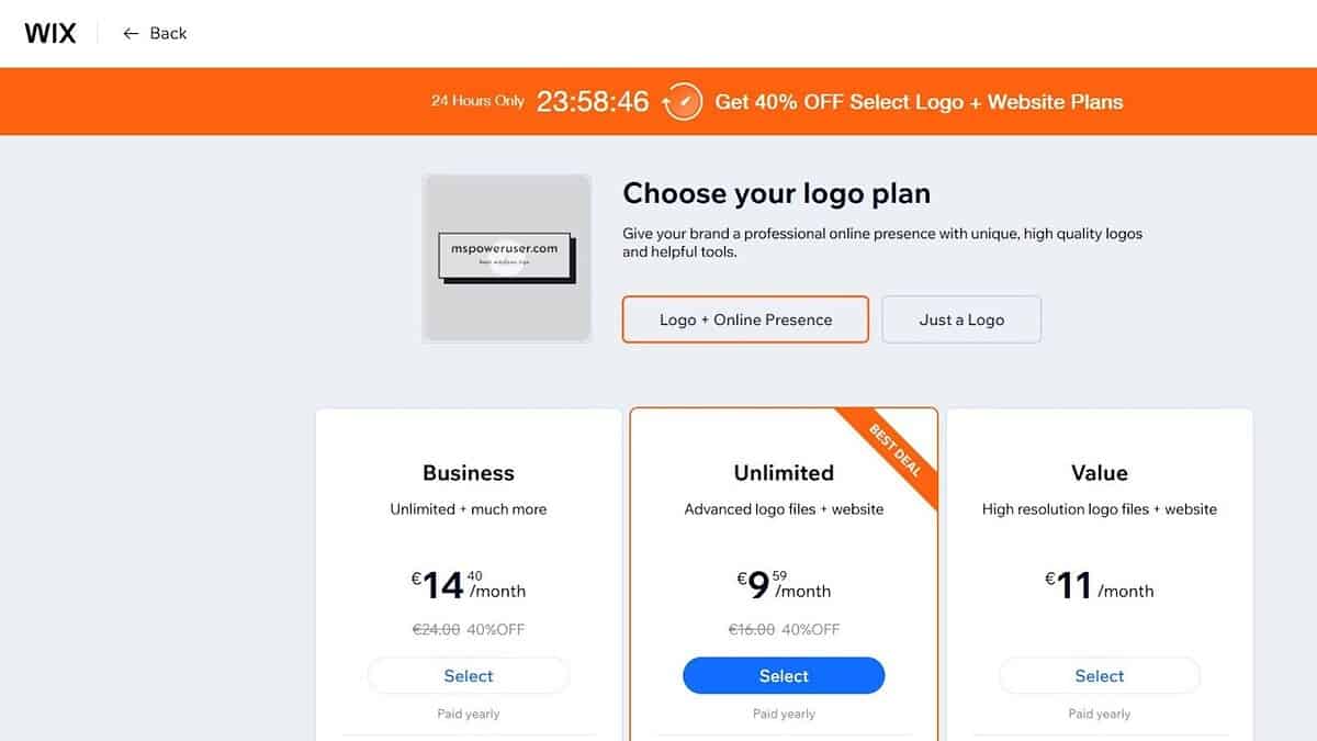 Wix uses a one-time logo purchase model plus optional website subscription upgrades. The cost varies depending on file format bundles, but ongoing branding features require a Wix premium site plan.