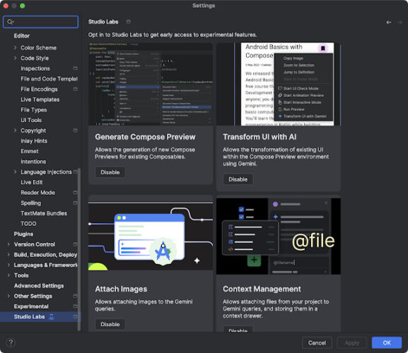 Developers can now test AI features in stable builds via the Studio Labs tab. Compose Preview tools also received major upgrades: automatic preview generation, resizable windows, inline UI editing using natural language, and file-based context sharing with Gemini.