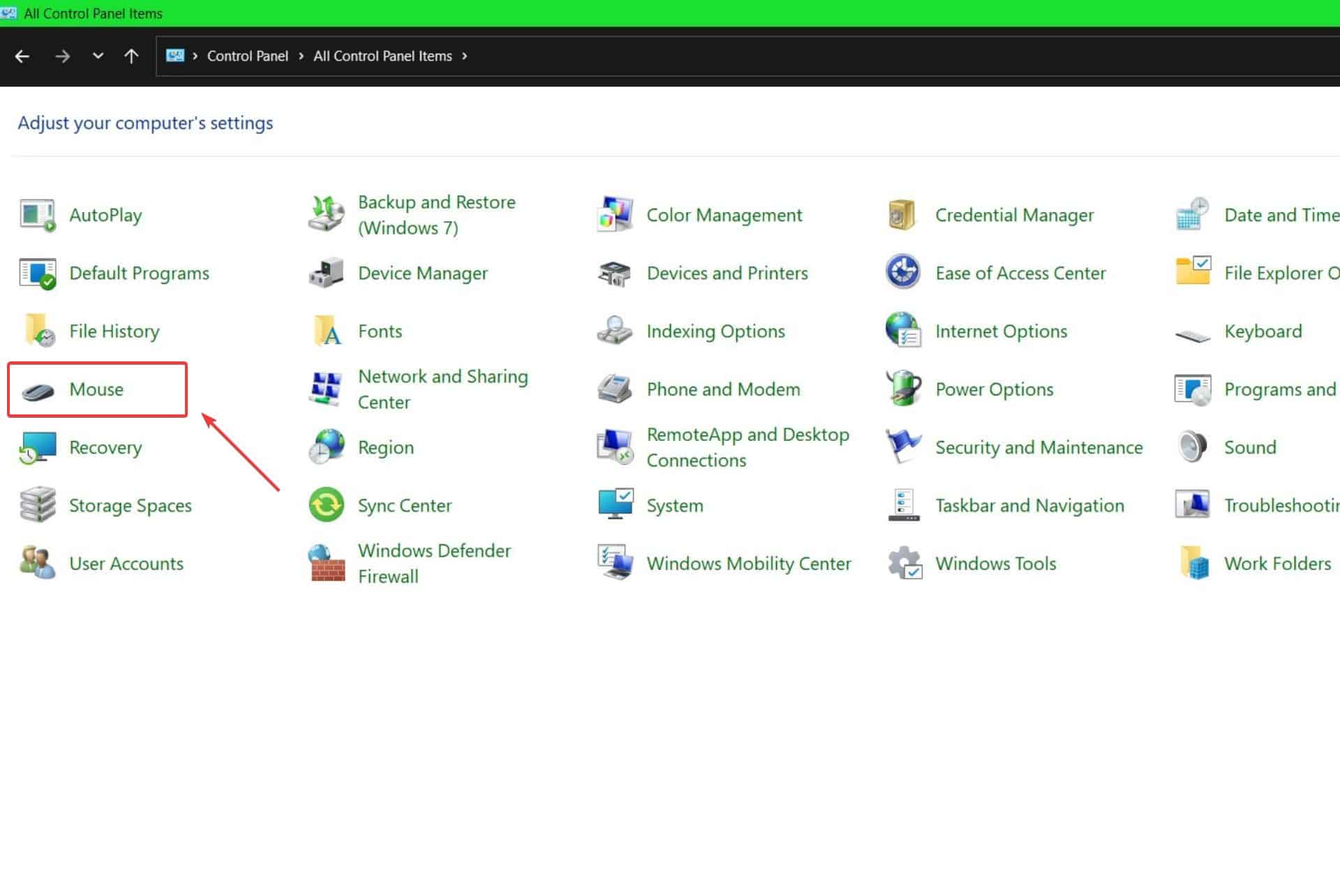 Find Mouse: In the Control Panel, search for “Mouse” and click on “Mouse”. Alternatively, change the “View by” option to “Large icons” or “Small icons” to easily locate the “Mouse” option.