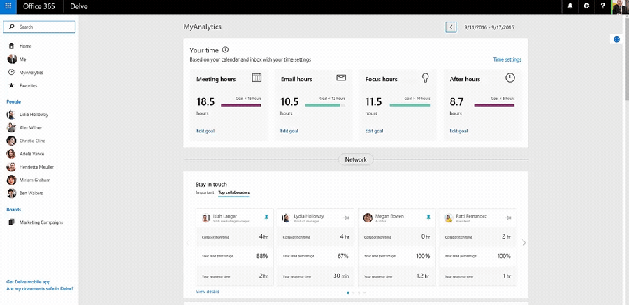 At Ignite conference today, Microsoft announced that they are renaming Delve Analytics to MyAnalytics. MyAnalytics is a personal analytics service in Office 365 that helps people understand how they spend time at work. Users will get information such as how much time they spend in meetings, or how long it takes someone to reply to their emails, is based on data they can already find in your mailbox and calendar.